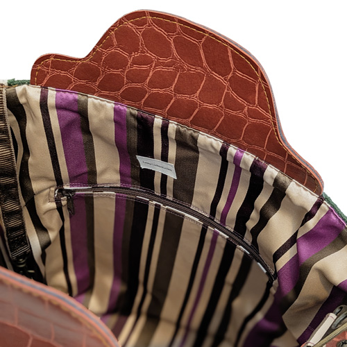 This bag is like magic – that purple striped interior with a key fob keeper on a velvet lanyard… the myriad of interior pockets with their secret lining fabrics will make you want to spend all day just looking into the bag… the sweetly rolled handles feel just so when you pick it up… and the reinforced detachable shoulder strap in the contrasting woven webbing, that’s like the icing on the cake if you ask me!