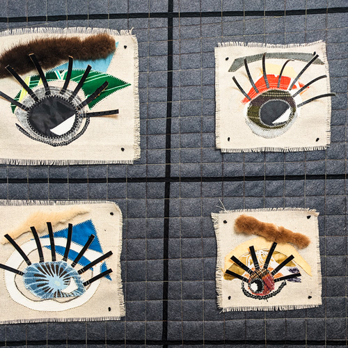 The overall structure beautifully contrasts the uniform grid quilting with the wildly expressive, complex nature of the eyes it contains. This large-scale textile work makes a profound statement about being seen and seeing others.