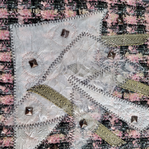 Custom collaging on the front slip pocket and the back panel create a striking design when paired with the multicolored fancy weave. Simple quilted accents, and contrast lining with two interior slip pockets and lobster claw key fob catcher mean you’ll never be searching for your phone, your lipstick, or your keys again.
