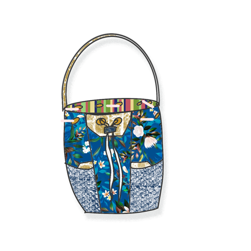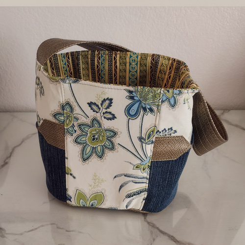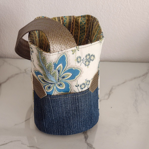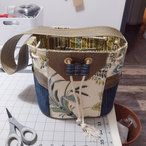 The wide vegan leather handle makes the bag easy for grab and go – one of the main requests for the bag. The blue toned floral pattern is an upscale outdoor fabric with stain protector built in; this also adds to the durability of the bag, but doesn’t make the finished product look like a patio chair cushion. The drawstring closure also makes it easy to cinch and even easier to get into the bag with a single hand.