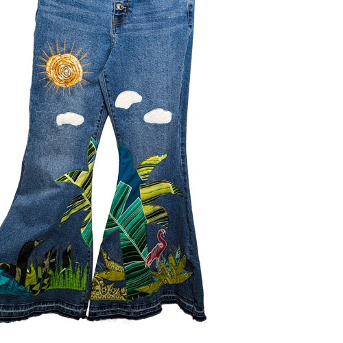 These jeans are a one-of-a-kind labor of love, masterfully upcycled from pre-loved thrifted pants to give them an entirely new, vibrant life. The drama begins at the hem with a stunning tropical landscape created from colorful deadstock and project scraps, featuring bold palm fronds and playful flamingos.