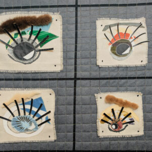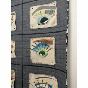 This fiber piece explores the themes of identity, surveillance, and perception in the modern age. Each eye is an individual construction, meticulously formed from upcycled and repurposed appliqué pieces that were lovingly reworked before being stitched together into this singular, unified composition. The materials add a compelling textural layer, incorporating elements like raw-edged burlap, vibrant fabric scraps, and soft fur that give each gaze a unique personality. The overall structure beautifully contrasts the uniform grid quilting with the wildly expressive, complex nature of the eyes it contains. This large-scale textile work makes a profound statement about being seen and seeing others.