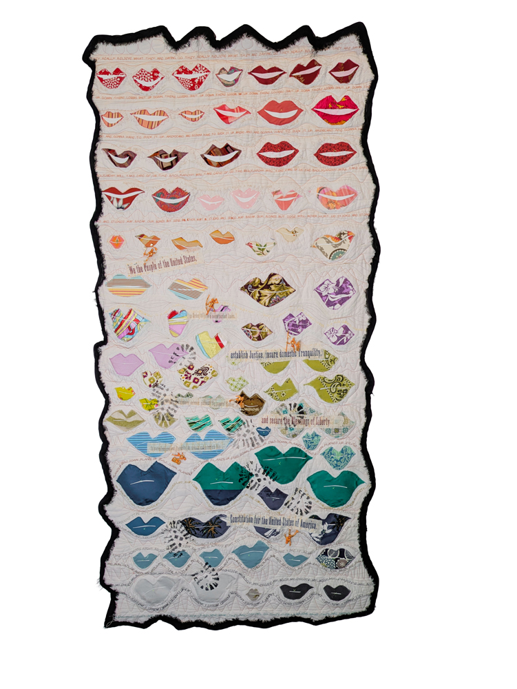 The most striking element is the repetition of the lips. Arranged in roughly ten horizontal rows, these stylized mouths transition from vibrant reds and warm pinks at the top to earthy greens, deep teals, and eventually ghostly grays and blacks at the bottom. The variety of fabrics used—ranging from polka dots and floral prints to solid, utilitarian blues—suggests a diverse “we the people,” a cacophony of different voices, classes, and backgrounds. Some mouths appear to be smiling, while others are set in a grim, flat line, creating a sense of a crowded room where everyone is speaking at once, yet the physical distance between the rows suggests a profound lack of communication.