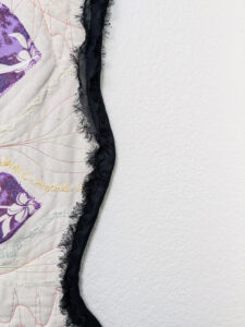The quilt’s physical structure reinforces its thematic tension. The background is a white, heavily quilted surface with undulating stitch patterns that mimic sound waves or topographical maps. This softness is violently contrasted by the jagged, irregular black border. The perimeter looks scorched or frayed, suggesting that the “Union” is being burned at the edges or that the frame can no longer contain the internal pressures of the piece.